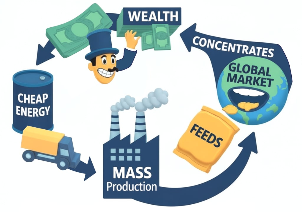 - That concentrated wealth is spent on infrastructure that can further leverage cheap fuel.
